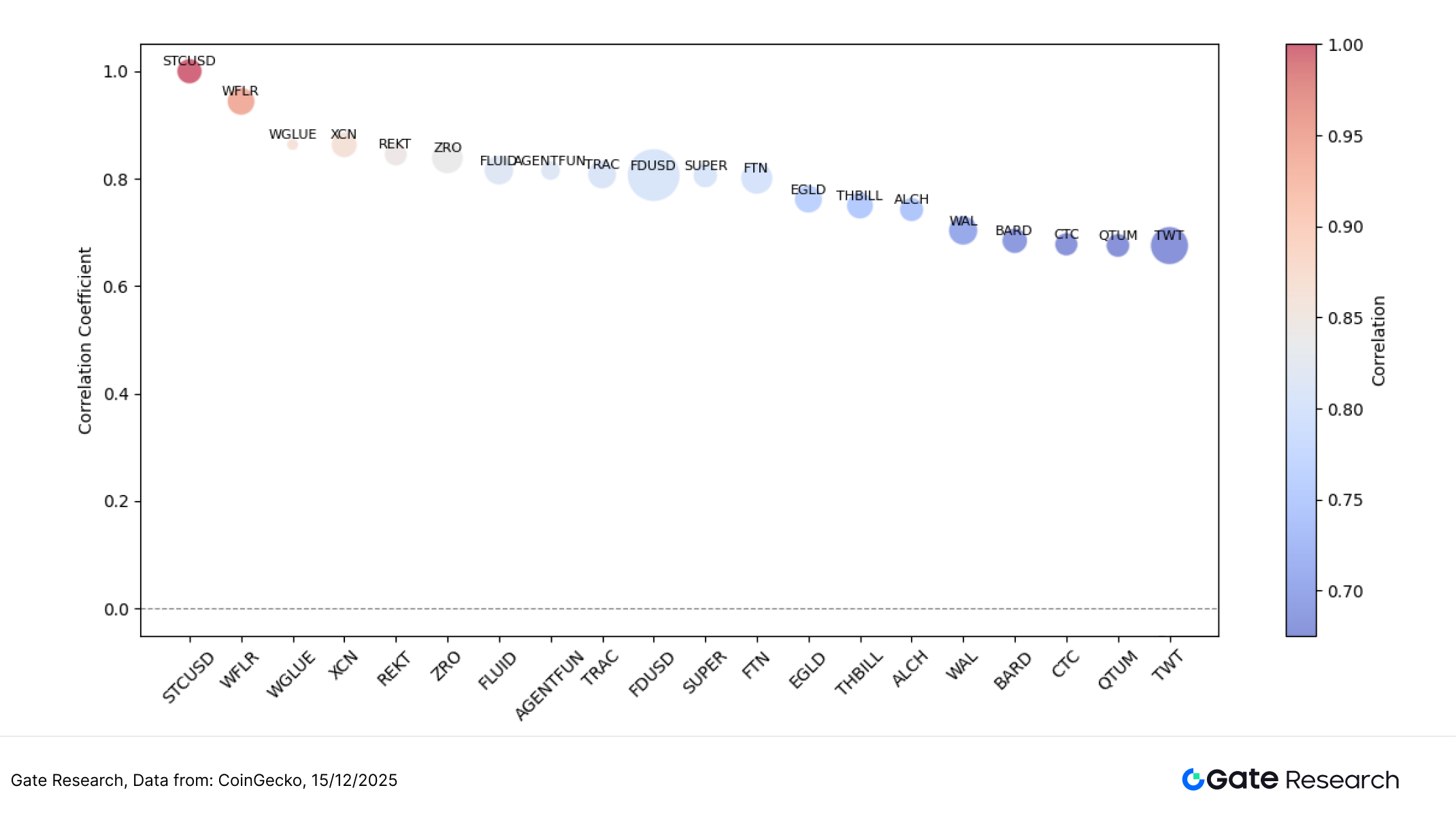 从图中可见,多数代币的相关性集中在 0.65–0.85 区间,显示当前市场中,价格波动在相当程度上仍受交易活跃度驱动,但并未呈现全面一致的强同步状态,反映资金行为已出现一定分层。