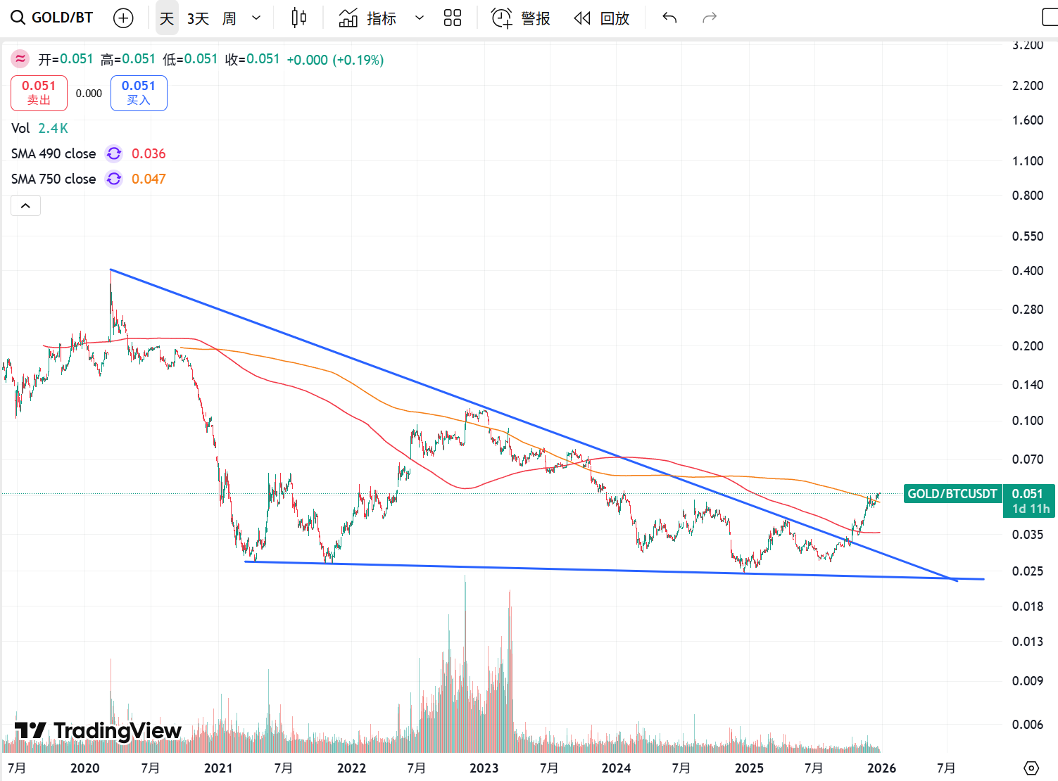 相较加密市场,最近一个月的资本市场主角在贵金属上,圈内预计的 4 季度行情并非没有发生,而是被白银夺舍了——当前白银仅仅在沪银上的月成交额已经超 75000 亿人民币,COMEX 上的期权持仓是市场真实库存的数倍,这种疯狂让人想起 2020-2021 的加密市场,而反观比特币的萎靡之态,令人唏嘘。具体来看,自 10 月来,黄金与比特币的相对价格强度也突破了 2020 年宽松以来的长期下行区间,让这种高位资金轮动体现的更加直观。