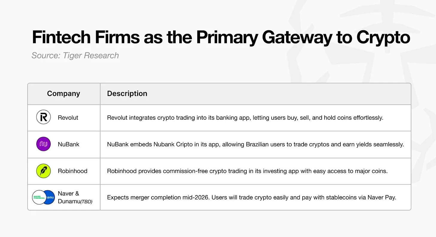 随着规则明朗化,金融科技应用已成为加密货币交易的首选。新用户不再需要使用加密货币交易所。他们可以在日常使用的应用中直接买卖。下一波增长将由这些金融科技工具引领。
