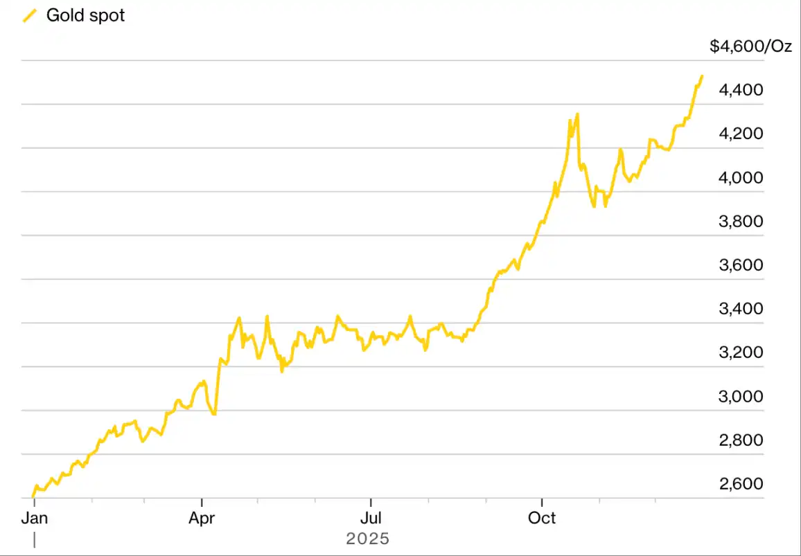 10 月,这一叙事达到高潮:对美国财政前景的担忧,叠加「史上最长政府停摆」,投资者开始寻求美元之外的避险工具。当月,黄金与比特币同步创下历史新高——对这两种常被视为「竞争对手」的资产而言,这是罕见的同步时刻。
