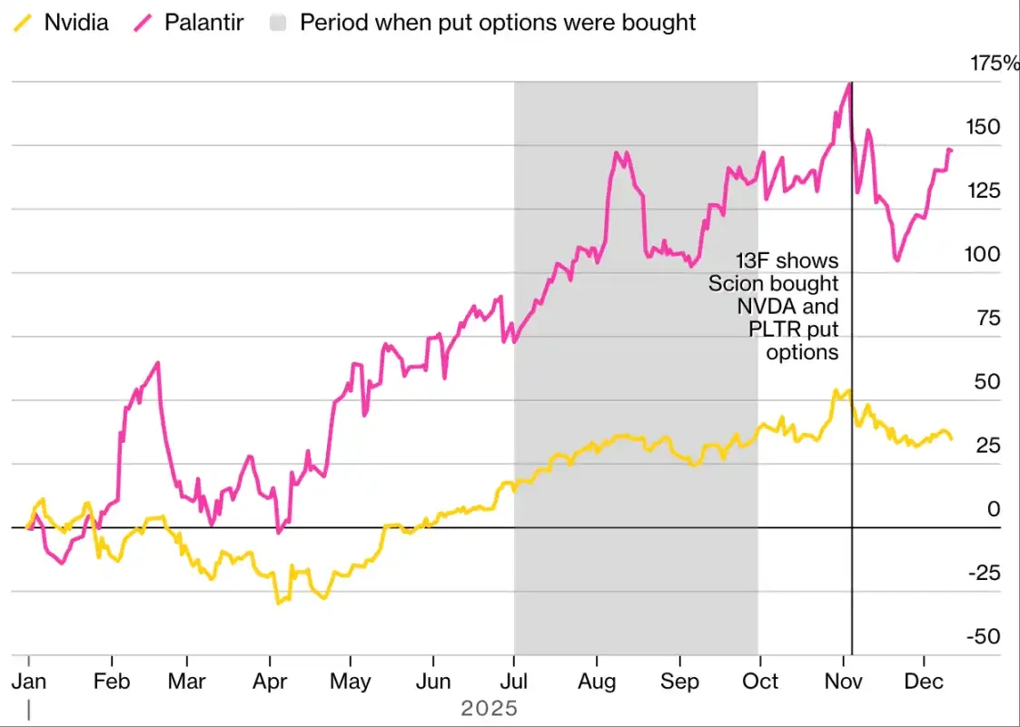 这笔交易在一份例行披露文件中曝光,但其影响却绝非「例行」。11 月 3 日,赛昂资产管理公司(Scion Asset Management)披露,持有英伟达(Nvidia)和帕兰提尔科技(Palantir Technologies)的保护性看跌期权——这两家公司是过去三年推动市场上涨的「人工智能核心股」。尽管赛昂并非规模庞大的对冲基金,但其管理者迈克尔・伯里(Michael Burry)让这份披露备受关注:伯里因在《大空头》一书及同名电影中「预言 2008 年次贷危机」而声名鹊起,成为市场公认的「预言家」。