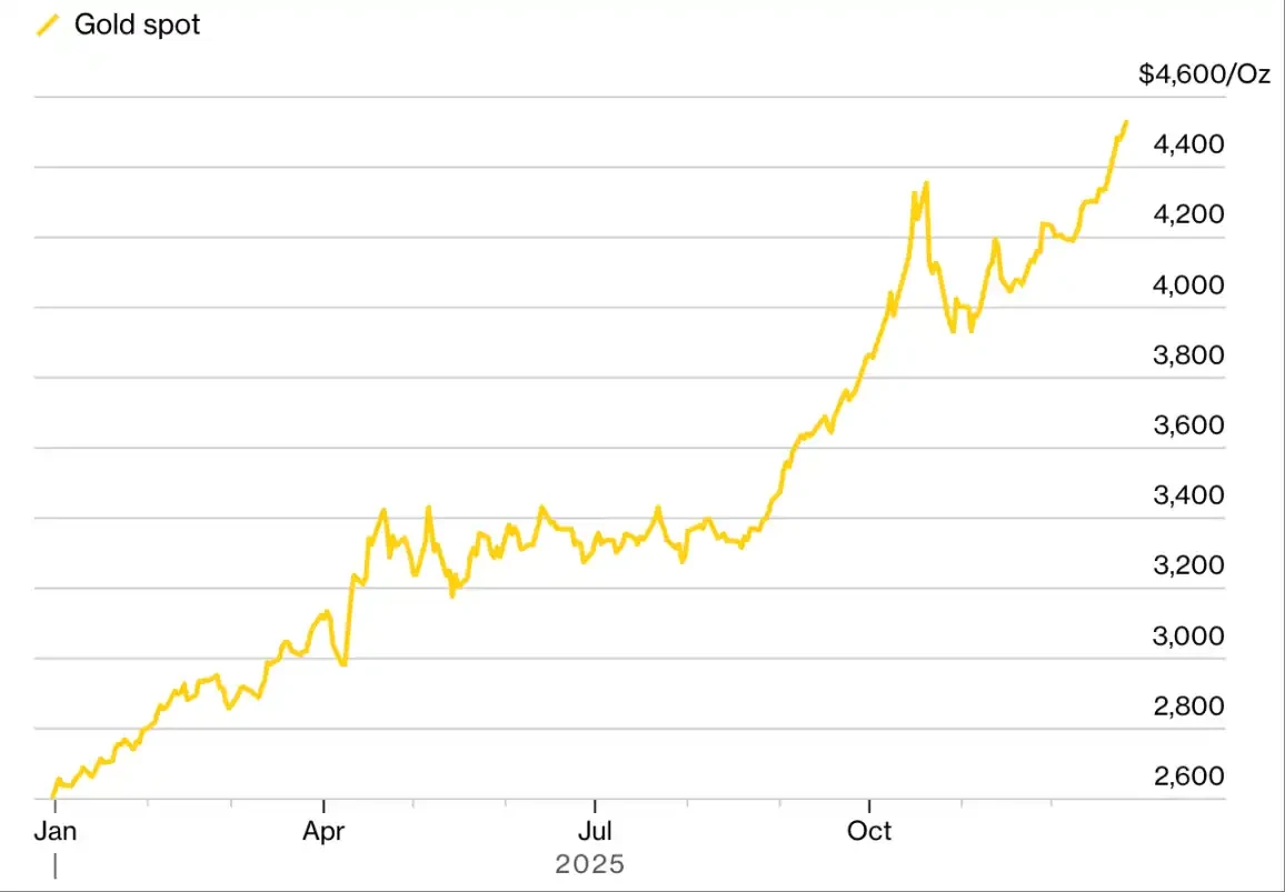 其他资产的价格走势则呈现分化:铜、铝甚至白银等金属的波动,一半源于「对货币贬值的担忧」,另一半则受特朗普关税政策和宏观力量驱动,这模糊了「通胀对冲」与「传统供应冲击」的界限。与此同时,黄金持续走强,不断刷新历史新高。在这一领域,「贬值交易」依然有效——但它不再是对「法定货币的全面否定」,更多是对「利率、政策与避险需求」的精准押注。
