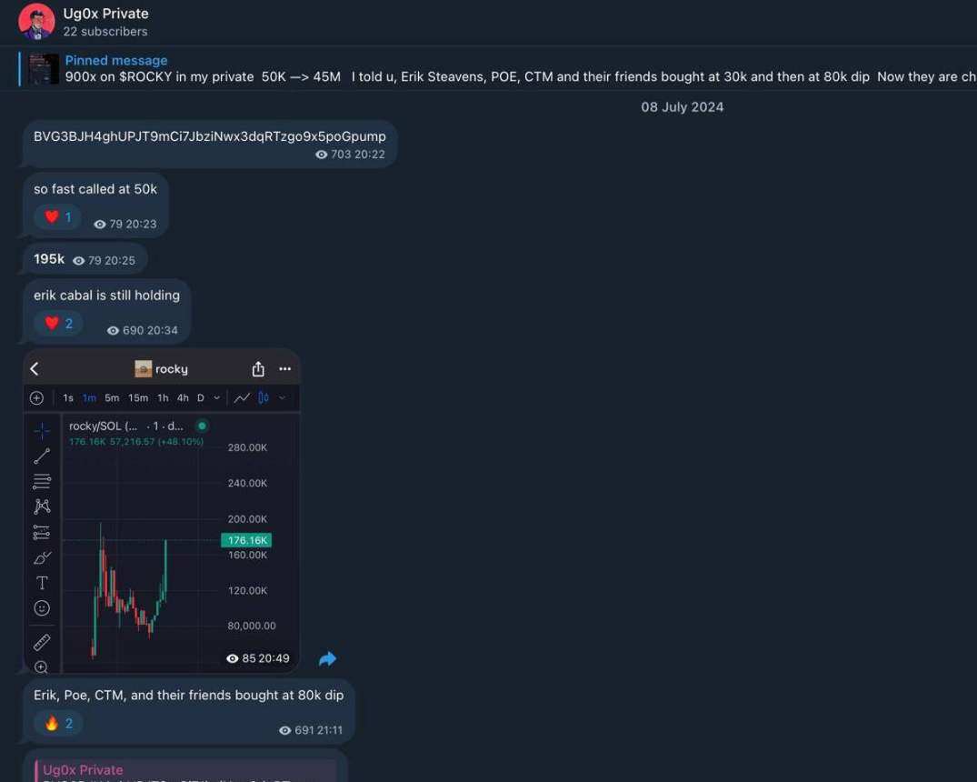 2024 年 7 月 8 日,围绕 $ROCKY 代币的一波操作就是绝佳案例。当时 Erik Steavens、POE、DOGEN 和 CTM 这些人,都在代币市值 1 万到 8 万美元区间内悄悄买入。