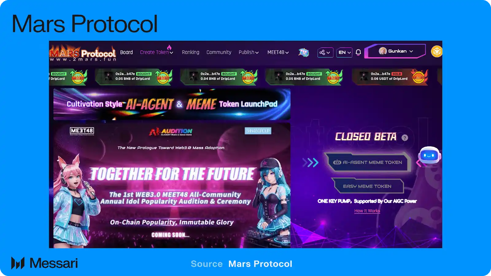 经济层的第二大支柱是 Mars Protocol。Mars Protocol 是 MEET48 的「偶像 Meme 平台」,旨在围绕真实与虚拟偶像,支持以增长驱动的代币经济。该协议支持创建社区驱动型代币,其 Bonding Curve 与粉丝增长及互动强度绑定,而非仅依赖孤立的投机需求。