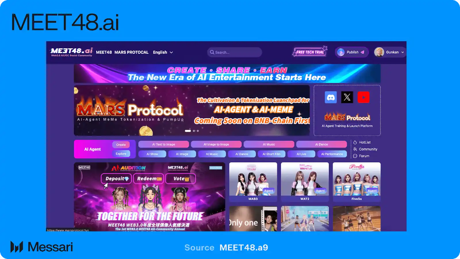 MEET48 将自己定位为 AI 用户生成内容(AIUGC)娱乐领域的早期领先者,试图把生成式 AI、虚拟偶像创作与链上参与整合进一个以粉丝驱动为核心的统一生态系统。