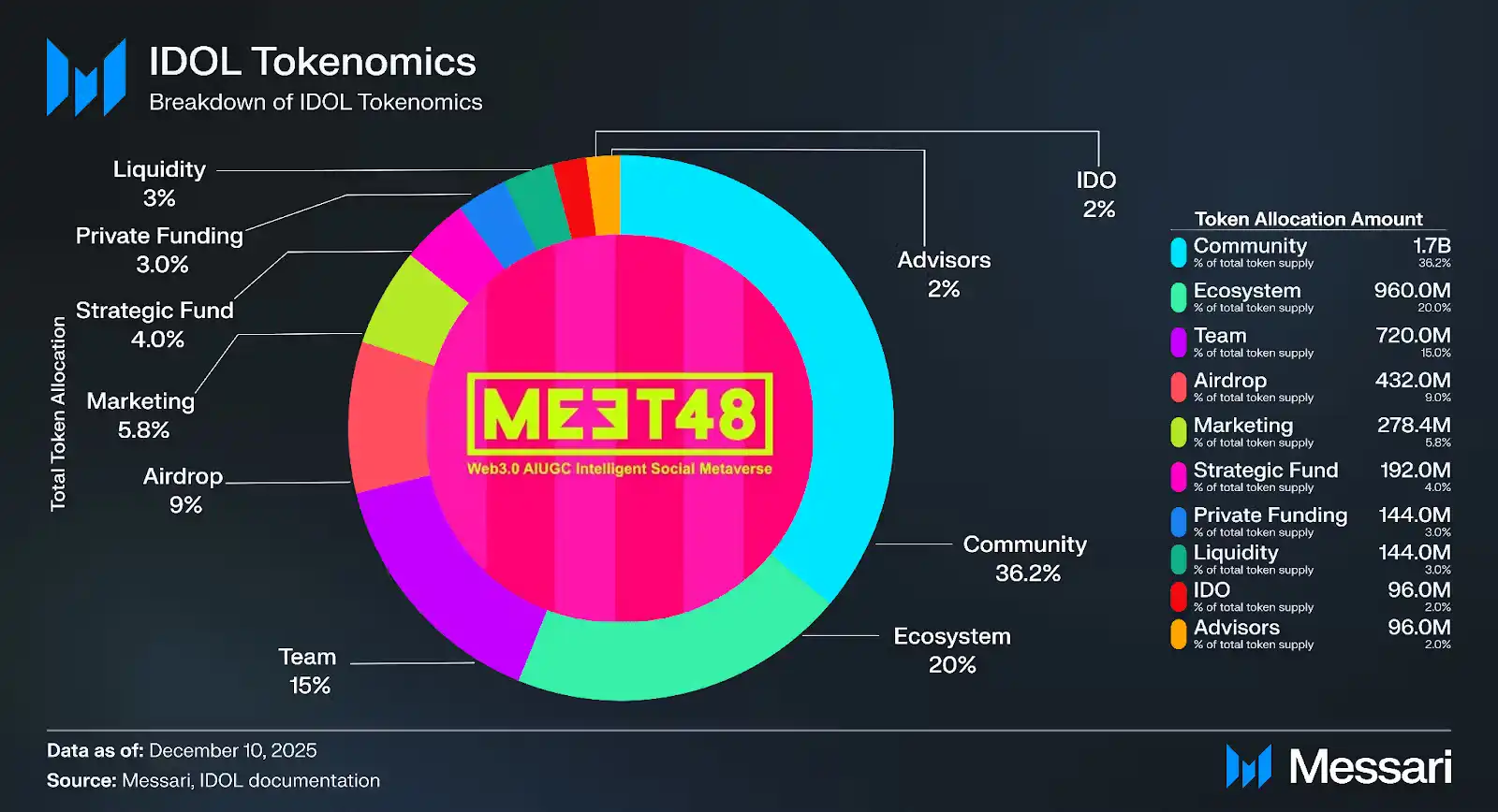 战略融资(4.0%):1.92 亿 IDOL,设置 12 个月锁定期,随后 24 个月线性释放。