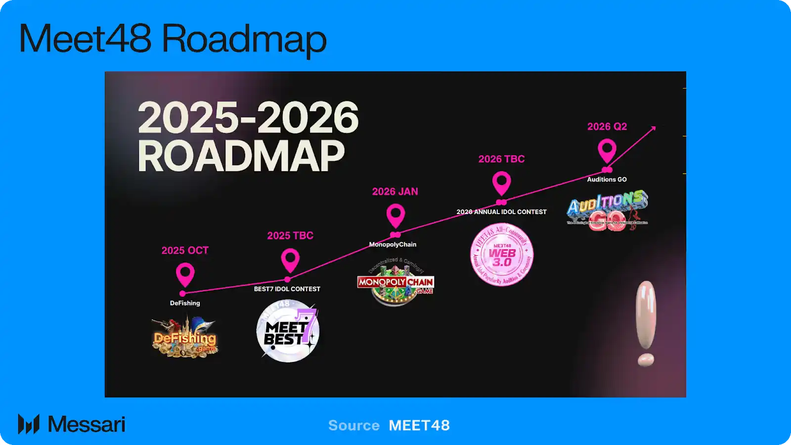 2024 年,团队上线 MEET48.ai,支持角色创建、表演编排与 AIUGC 工作流。同一时期,MEET48 App 在 BNB Chain 上发布,引入了代币化投票活动与链上粉丝互动机制。2025 年 6 月 11 日,MEET48 在 Binance Alpha、Bitget、Gate.io、MEXC、Kucoin 和 PancakeSwap 多平台上线了 IDOL 代币。