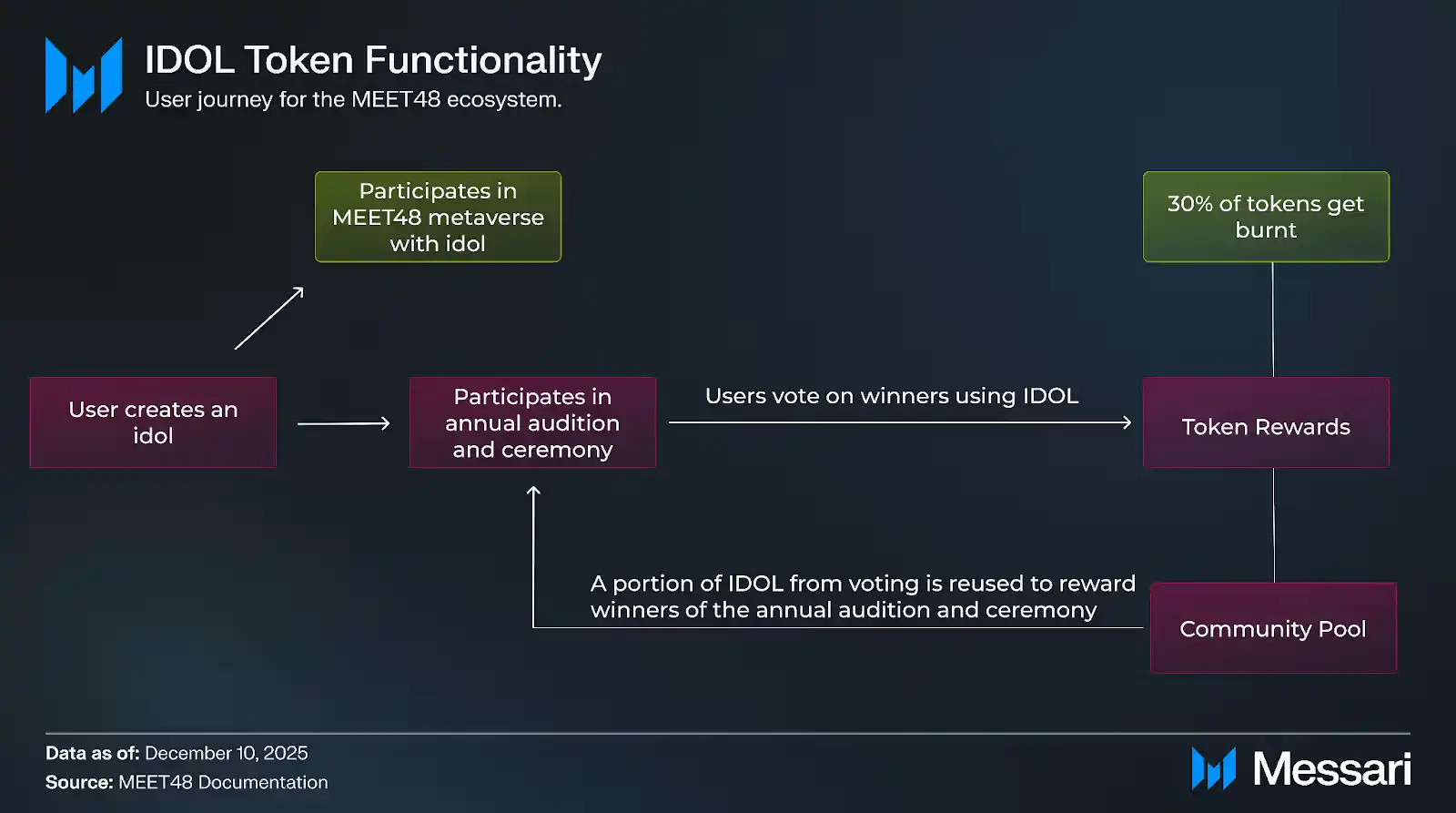 MEET48 生态包含年度偶像总决选,作为一种可重复运转的机制,用于驱动粉丝参与、内容发现与代币使用。该活动允许粉丝使用 IDOL 代币为参赛偶像(真实偶像与虚拟偶像)投票。投票结果会影响排名、平台内可见度,以及后续内容发布与生态计划的参与资格。因此,这一竞赛更像是一种结构化的粉丝参与信号,而不仅是纯宣传活动。