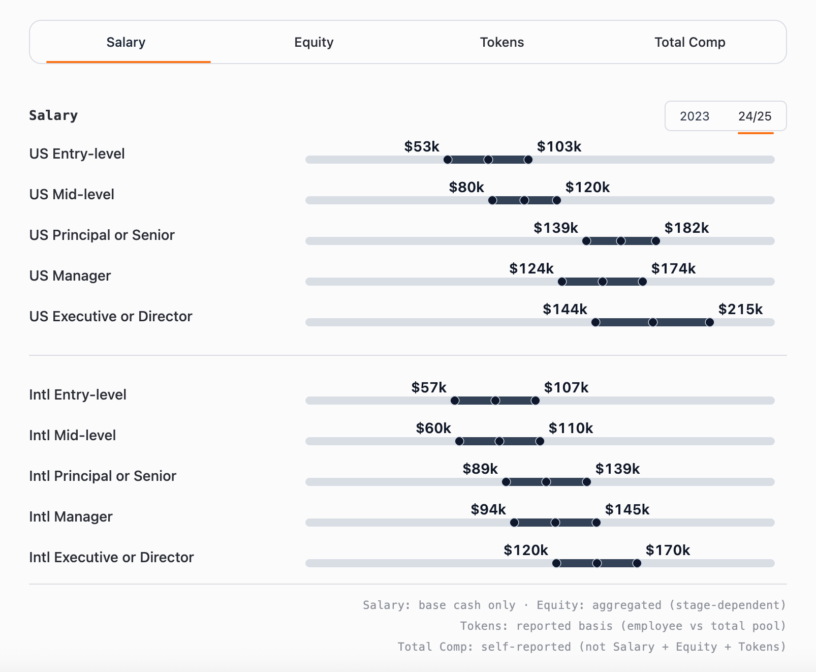 总的来说,几乎所有职级的薪资与代币授予均有所下降。美国岗位在现金薪酬上依然领先,而国际团队则通过更高比例的股权与代币配置缩小了差距。
