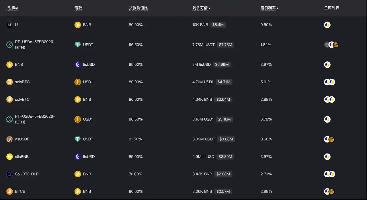 这个板块更适合持有 BTCB、ETH、BNB 等主流资产的钻石手。如果你计划进行一笔为期 3-6 个月的确定性投资,比如参与某个长期质押挖矿,这种模式能让你精确计算出利息成本,避免因市场借贷利率飙升而被迫平仓。