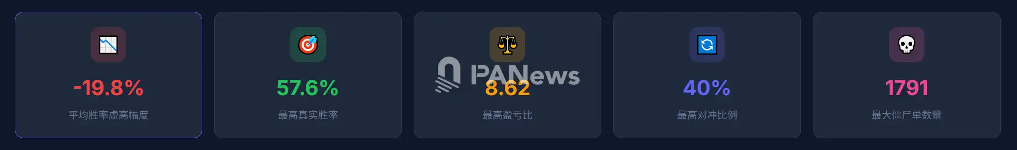 首先,他的真实胜率只有 42%,是这些地址当中最低的,且盈亏比只有 1.62。这两项数据的结合来看,他的盈利预期是负值,总体来说这个策略是不会赚钱的。