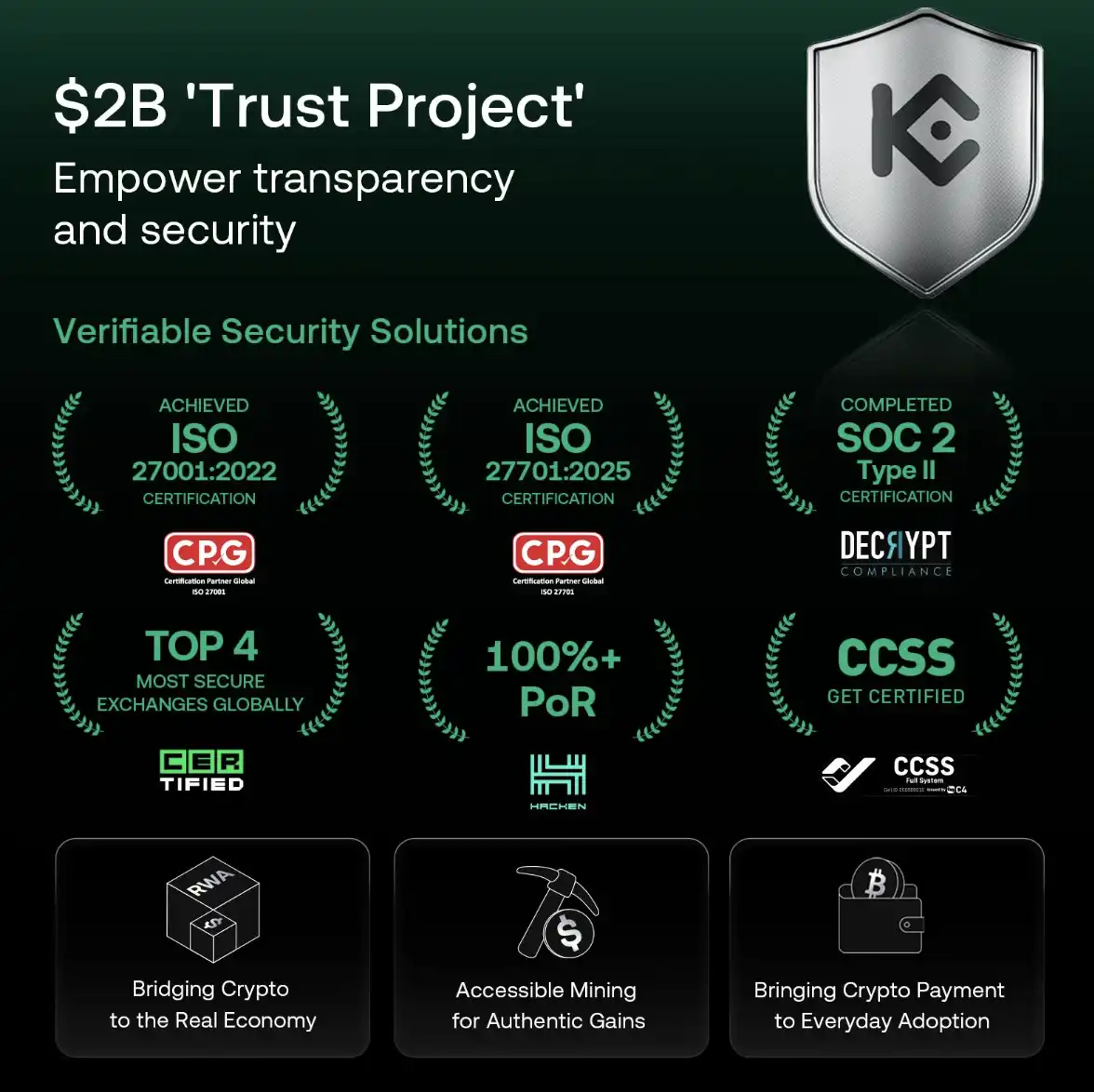 除了澳大利亚 AUSTRAC 数字货币交易所注册和 MiCAR 牌照之外,KuCoin 还是目前全球头部交易所中唯一同时获得 SOC 2 Type II、ISO 27001、ISO 27701 和 CCSS 四大顶级安全认证的平台。加上 CER.live 的 AAA 级安全评级及长期坚持的第三方审计储备证明(PoR),KuCoin 实际上已经建立了一套足以比肩传统金融机构的风控与安全体系。