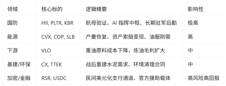 短期内,战争恐慌可能推高油价,但中长期来看,委内瑞拉的回归是巨大的供给侧冲击。如果产量在数年内恢复到 300 万桶 / 日,将对 OPEC+ 的减产努力构成巨大挑战,可能导致油价长期承压。但这对于以炼油和化工为主的下游企业,以及航空运输业(如达美航空 DAL、联合航空 UAL)是重大利好。