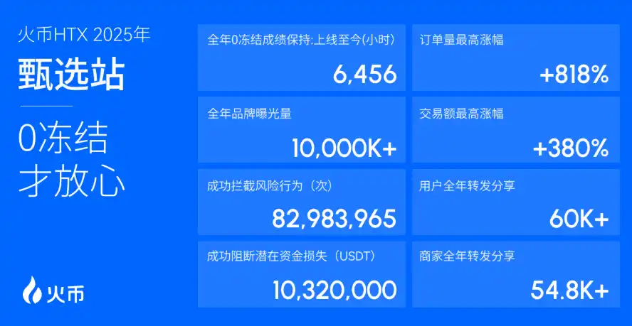 其中,C2C 甄选站作为年度最具标志性的创新之一,引领了行业场外交易服务升级。该专区通过严格的商家准入机制、全流程风控体系及「100% 全额赔付」保障机制,自上线以来保持 0 冻结记录,在安全性与交易效率方面树立行业新标准。通过 0 手续费政策与智能撮合系统,火币甄选站在保障合规与用户体验的同时,重塑了 C2C 交易的信任机制,成为行业服务范式升级的重要样本。