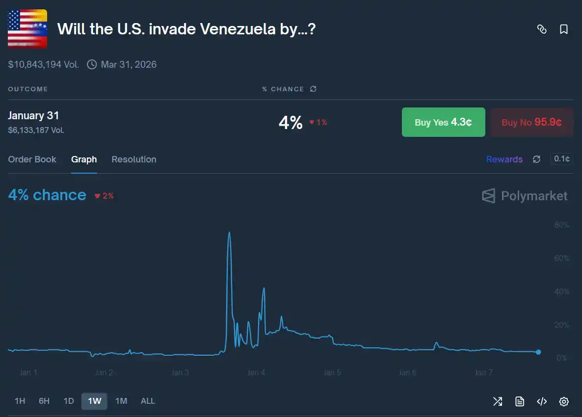 即使是在川普于袭击后大言不惭地说出「run Venezuela(运营委内瑞拉)」后,截至本文发稿,该盘口仍未结算,概率已回落至 4%。