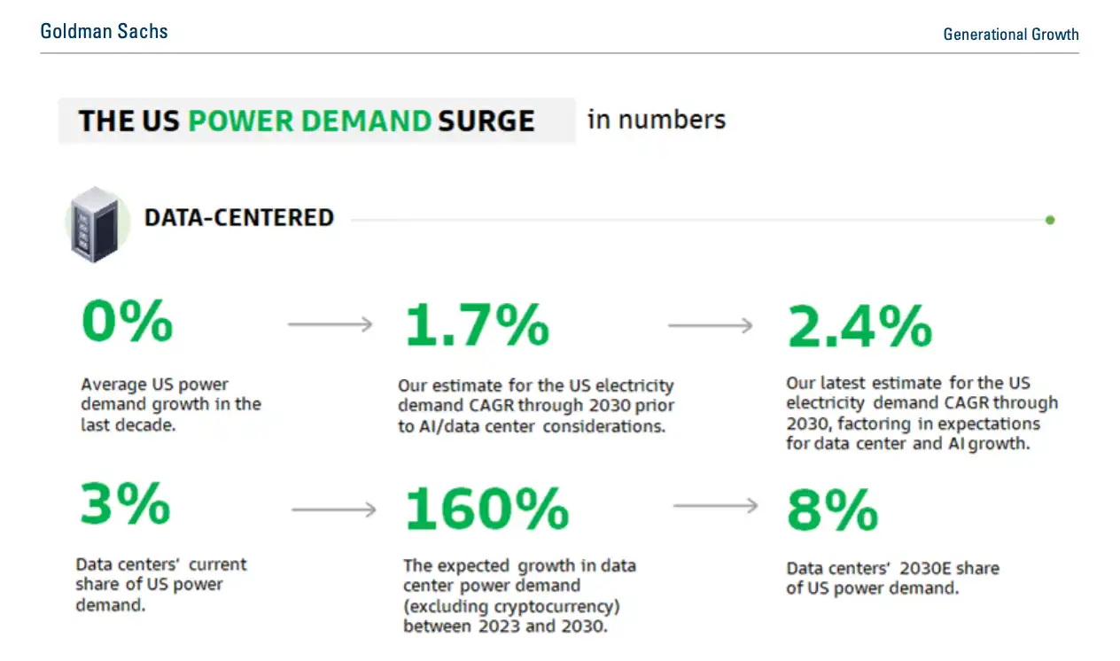从 2023 年到 2030 年,美国数据中心电力需求的 年复合增长率为 15%,这将使数据中心占美国总电力需求的比例从目前的 3% 提升至 2030 年的 8%。」