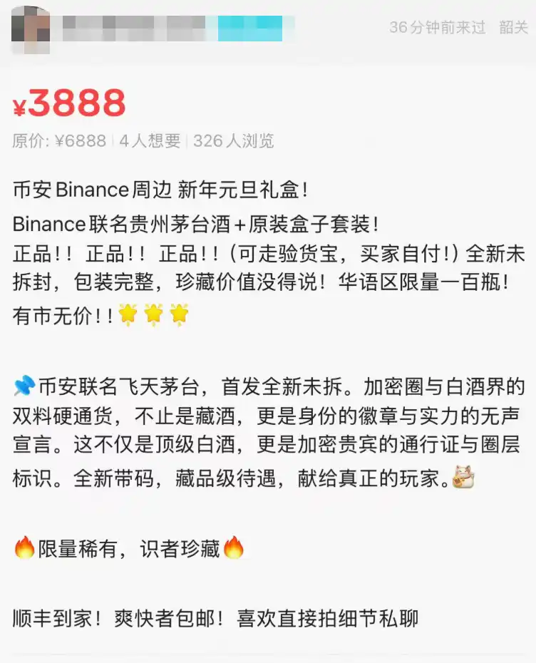 最后,根据在闲鱼上的搜索结果,可堪压轴的当属这瓶来自币安的飞天茅台: