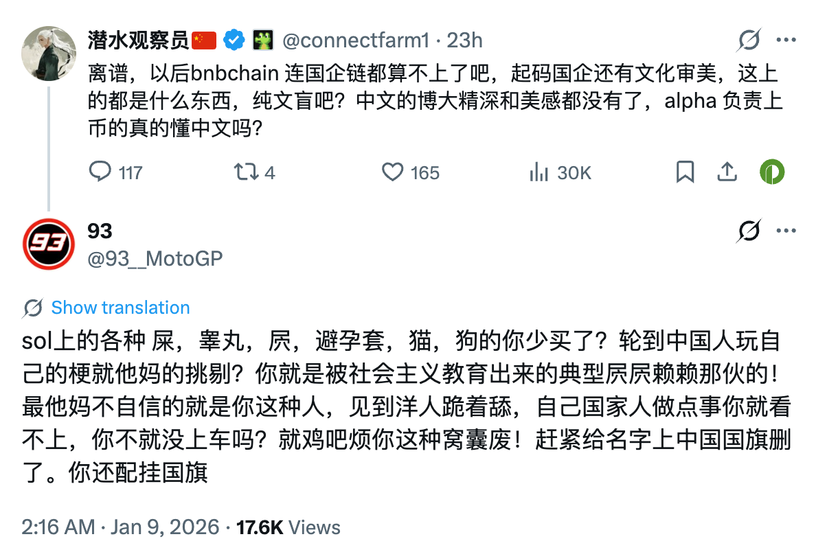 针对此事,加密 KOL 潜水观察员从探讨中文语言纯粹性的角度发文表示,“离谱,以后 BNB Chain 连国企链都算不上了吧,起码国企还有文化审美,这上的都是什么东西,纯文盲吧?中文的博大精深和美感都没有了,alpha 负责上币的真的懂中文吗?”