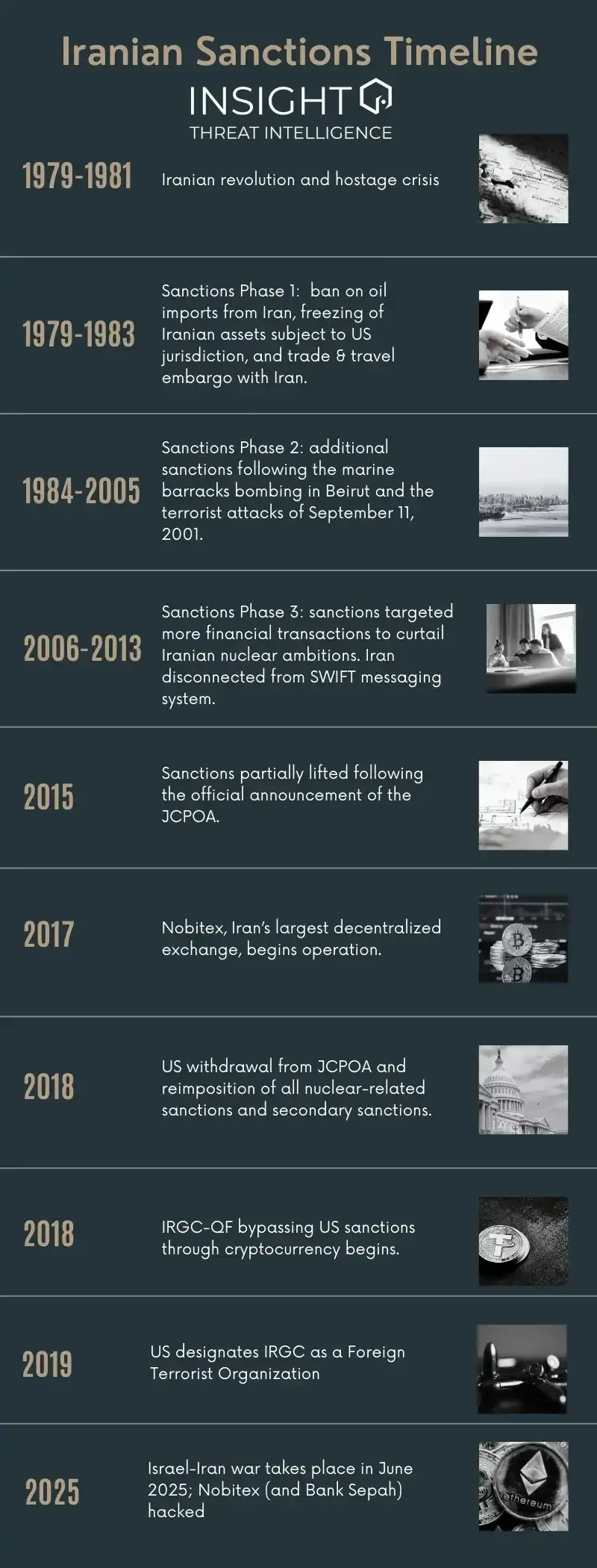 伊朗制裁时间轴显示,在数十年高强度制裁下,伊朗逐步从传统金融体系被「挤出」,并最终将加密货币纳入国家级的规避制裁、融资与地缘博弈工具箱之中。具体而言,自 1979 年伊朗革命与人质危机后,美国对伊朗实施首轮制裁,禁止石油进口、冻结资产,并施加贸易与旅行禁运;1984 年至 2005 年间,在多起恐怖主义相关事件背景下,制裁持续加码;2006 年至 2013 年,制裁重点转向金融领域,以遏制伊朗核计划,伊朗被切断与 SWIFT 系统的连接。2015 年《联合全面行动计划》宣布后制裁一度部分解除,但 2018 年美国退出该协议,重新实施所有核相关及次级制裁。同年,伊朗最大的去中心化交易所 Nobitex 开始运营,伊斯兰革命卫队圣城旅也开始通过加密货币规避美国制裁。2019 年,美国将伊斯兰革命卫队列为外国恐怖组织。到 2025 年 6 月,以色列与伊朗爆发战争,Nobitex 及 Sepah 银行遭到黑客攻击,显示制裁、金融体系与加密基础设施已深度卷入地缘政治冲突之中。