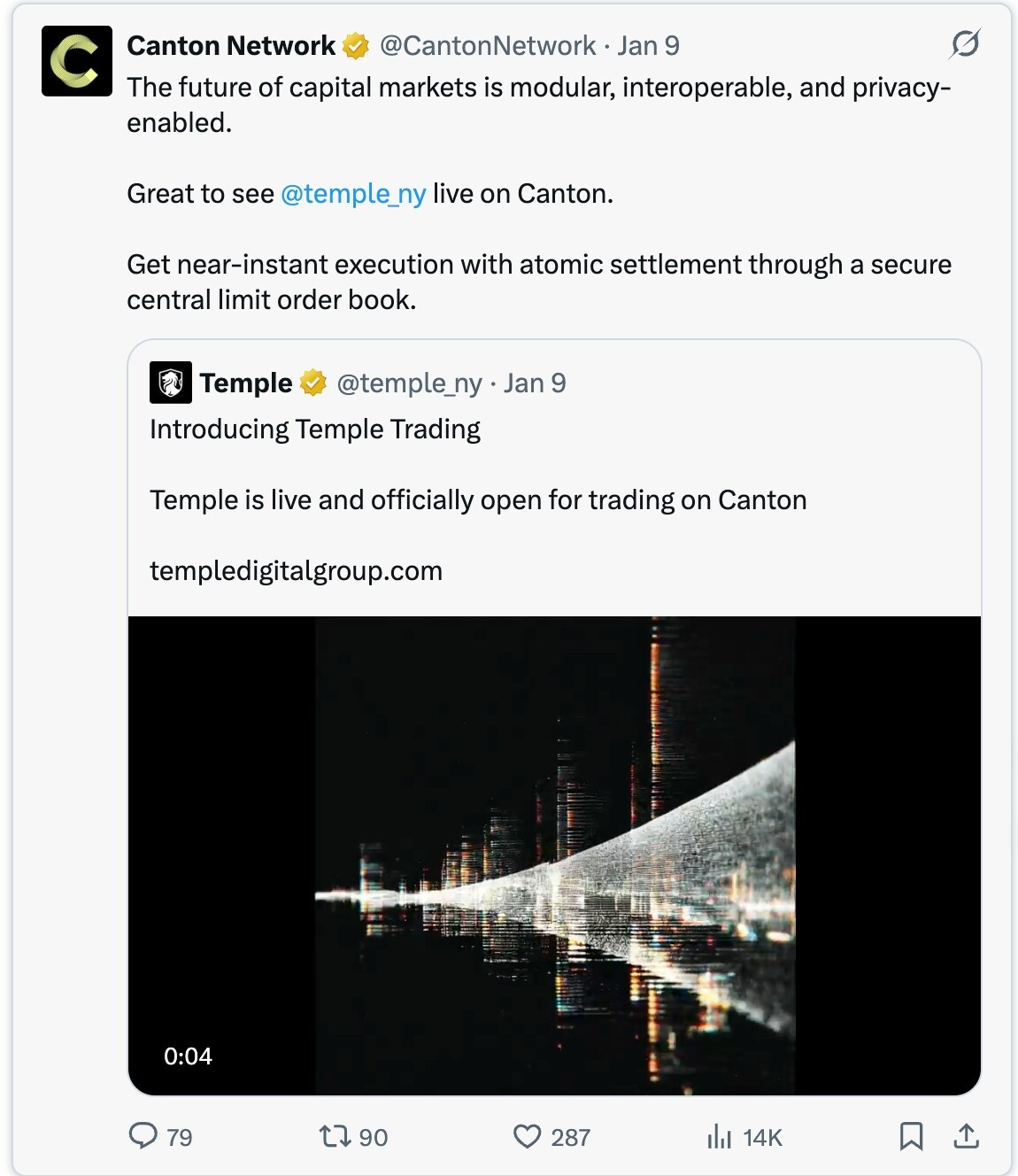 - Canton 的 DTCC MVP → 测试机构级结算能力;
