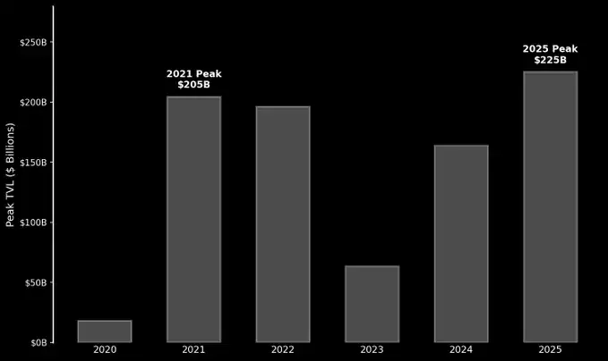 2025 年,DeFi 的总锁仓量(TVL)创下新的历史高点,但相较于 2021 年的峰值,并没有高出太多。在市场逐渐降温之后,一个值得重新审视的问题是:下一波资金和用户将从哪里来?