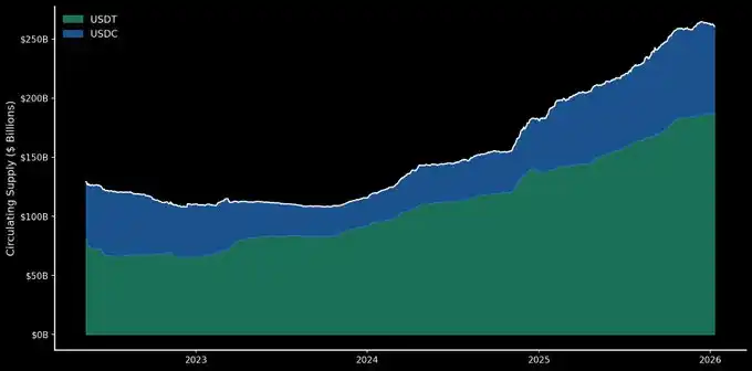 过去一年,稳定币市场是最大的受益者之一。链上的美元规模达到历史新高,前所未有地多。USDT 和 USDC 持续稳步增长,两者合计市值已超过 2600 亿美元——也就是说,单是稳定币的体量,已经大于整个 DeFi 市场。