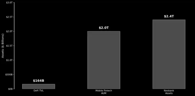 要看清这片机会有多大,不妨将 DeFi 与金融科技对比。目前整个 DeFi 的 TVL 约为 1640 亿美元。而全球移动金融科技应用管理的客户资产超过 2 万亿美元;仅前 100 家 新型银行(neobanks)的资产规模就达到 2.4 万亿美元。相比之下,DeFi 目前几乎只是一个可以忽略不计的零头。