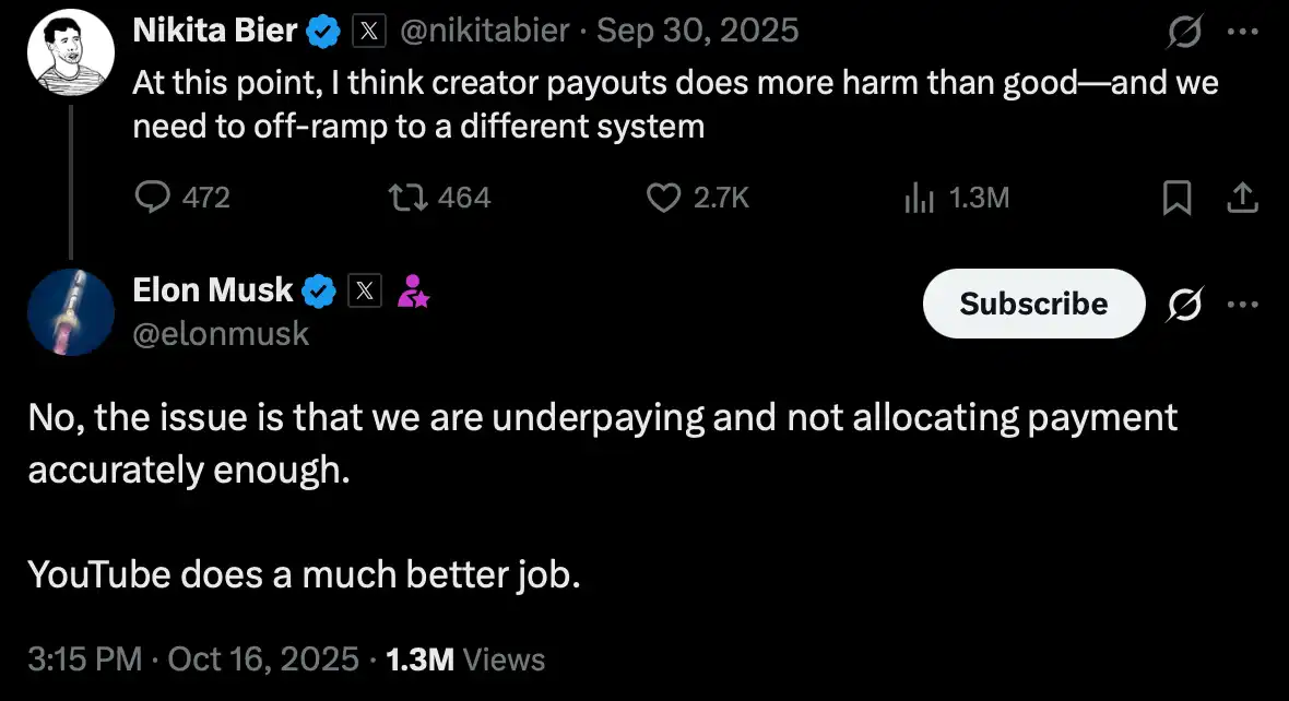 这种野心带来的压力,不只是「在创作者收入方面还不够好」,不只限于在马斯克和他的员工之间传导,而是传导到了用户的实际感知上,这就是 X 现在面临的一个问题。