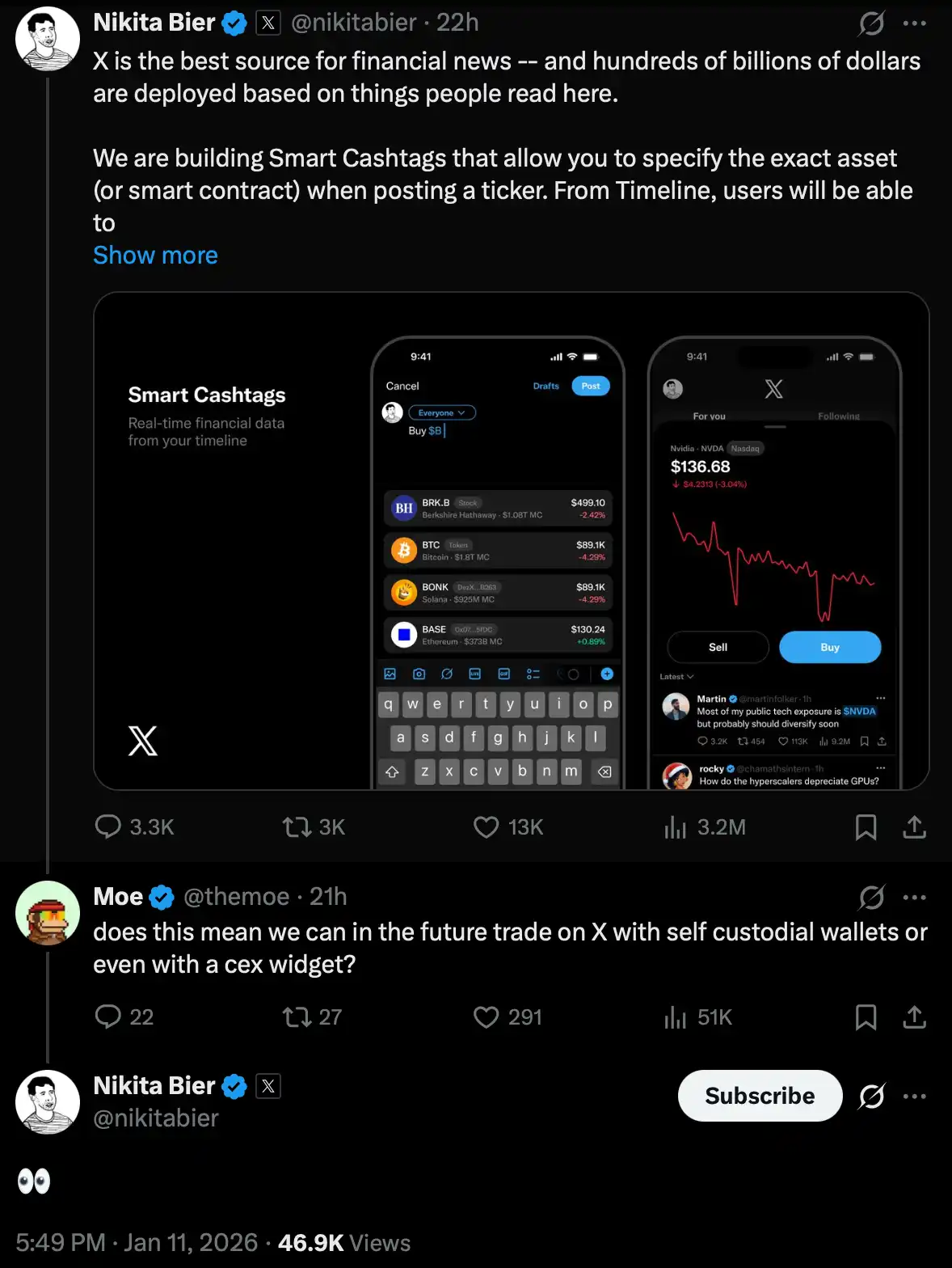 1 月 11 日,X(推特) 产品负责人 Nikita Bier 宣布,将在下个月公开上线 Smart Cashtags 功能。该功能将使得推文内容中出现的资产 ticker 能够确切指向所提及的目标资产,尤其是加密货币能够根据代币的合约地址来确切指向。当用户点击这些推文中出现的 ticker 时,他们将能够看到对应的实时价格走势以及 X 上围绕该资产的所有讨论。