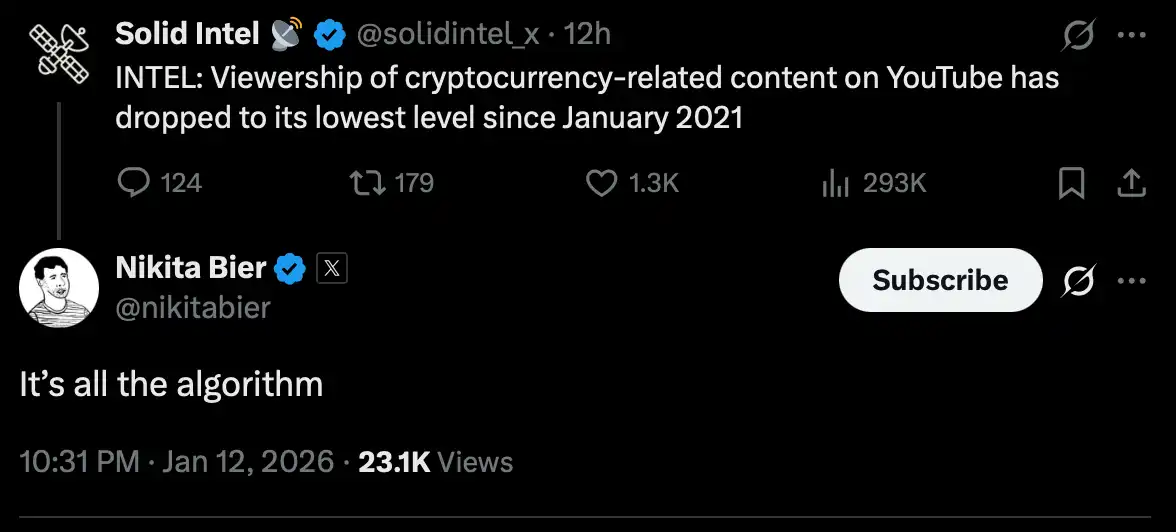 算法统治注意力的年代,大公司的利润榨取已经是一条沉默又残酷的流水线,这就让发生在 X 上的「币命贵」运动显示出了难得的「活人感」。尽管,这次被惹怒的群体仍然只是 X 上的一小部分特定的币圈玩家,但他们表达愤怒的,却不仅仅是 X 产品负责人 Nikita 话语中透露出的对加密文化的不尊重,更是对算法所导致的社交环境失真的抗议。
