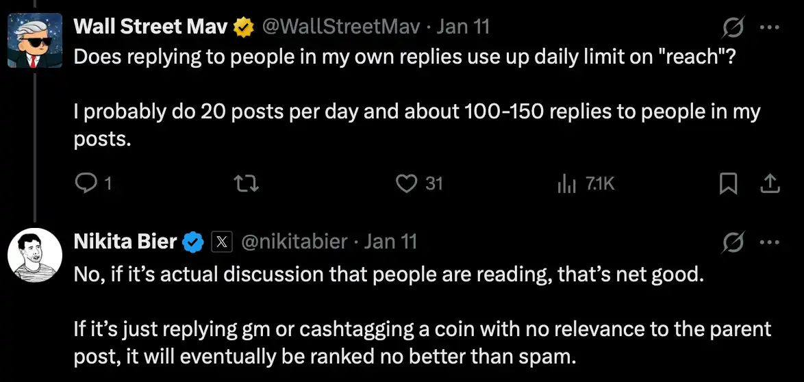 Nikita 更新后的说法是,如果你只是毫无目的地在某条推文下刷和推文内容毫不相关的「gm」或者不管不顾地在评论区推销某个币,才会被认为是垃圾信息从而被限流。