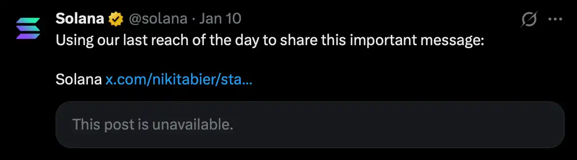 Solana 在这次「币命贵」运动里堪称带头冲锋,其运营展现了敏锐的网感。经典之作还包括引用了 Nikita 那条已删除的回复,并附上,「用掉我们今天最后的曝光度,以向您传递来自 Nikita 的重要信息,Solana」。