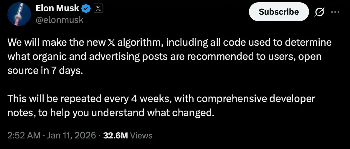 但是,情绪蔓延开来以后,这种找补已经无效。此时,马斯克跳出来了,而且带来的是一个爆炸性的消息——X 的内容推荐算法要更新并且在一周内开源,并且会每 4 周更新一次,持续更新持续开源。事情发展到这里,「币命贵」运动已经爆发了惊人的能量——世界上从来没有一个顶级的社交媒体要开源自己的内容推荐算法,这是前无古人的第一次。这件事情就发生在币圈人因为愤怒开始集体反击 Nikita 之后。