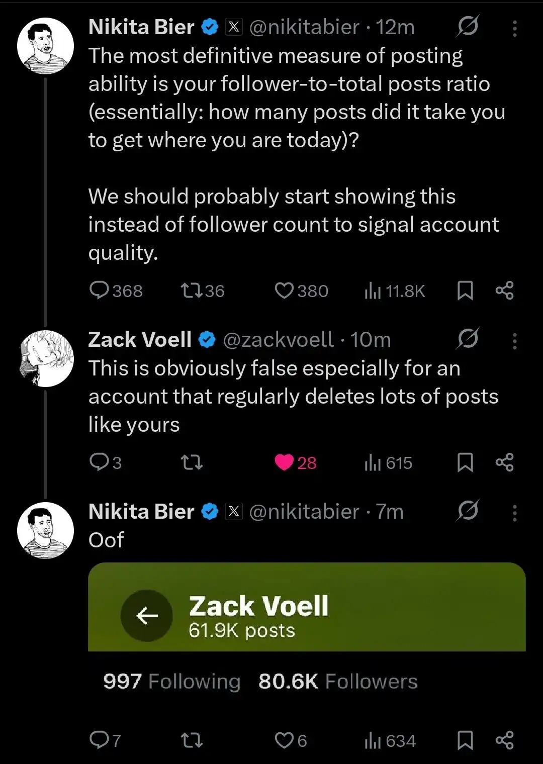 同时,他也在持续和人对线,持续删掉引起众怒的回复。比如他提出了一个衡量「发帖能力」的指标,用粉丝量和总发帖数的比例取代单纯的粉丝量指标。有人回复他,「这显然不管用,因为你就经常删帖」。然后 Nikita 就贴出了这名用户的总发帖量和粉丝数量进行嘲讽:
