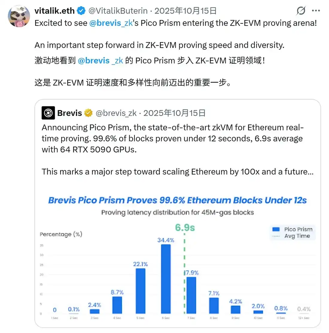 例如,之前 Vitalik 就专门提及过 Brevis 的 ZK-VM 的性能表现,并且期待它们进入 ZK-EVM 领域。