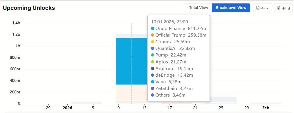 1 月 4 日,据 onchainschool.pro 监测,下周预计将有价值超过 10 亿美元的代币解锁,其中包括 ONDO、TRUMP、PUMP、APTOS 等多个知名项目。