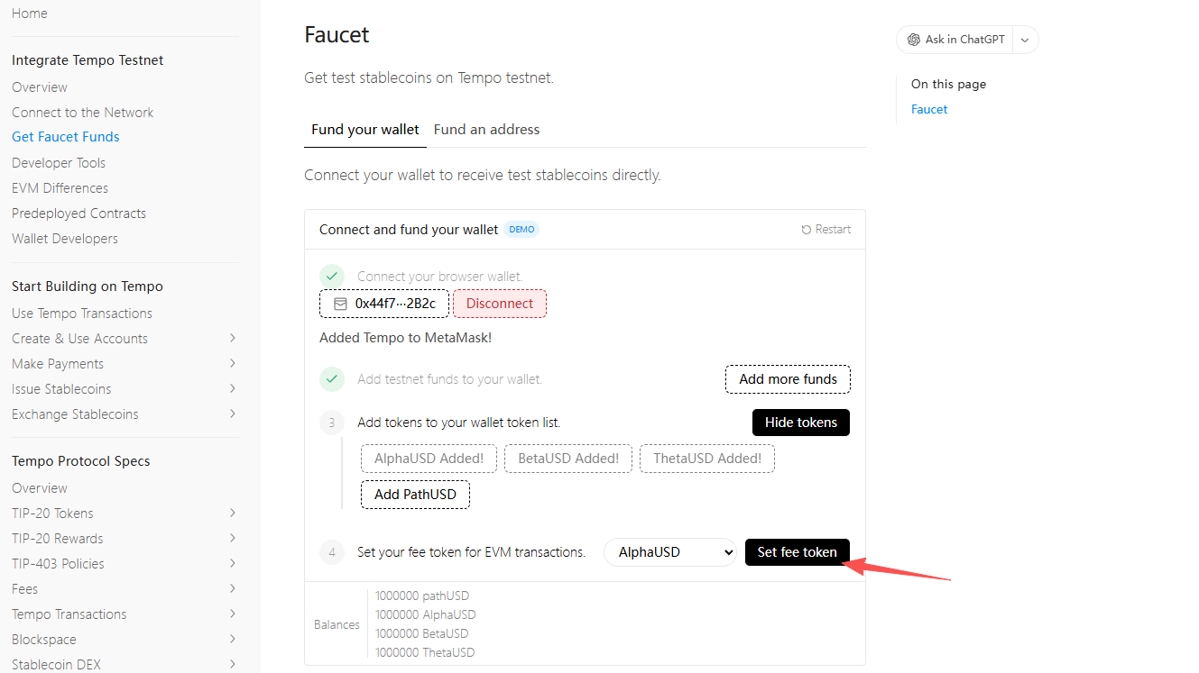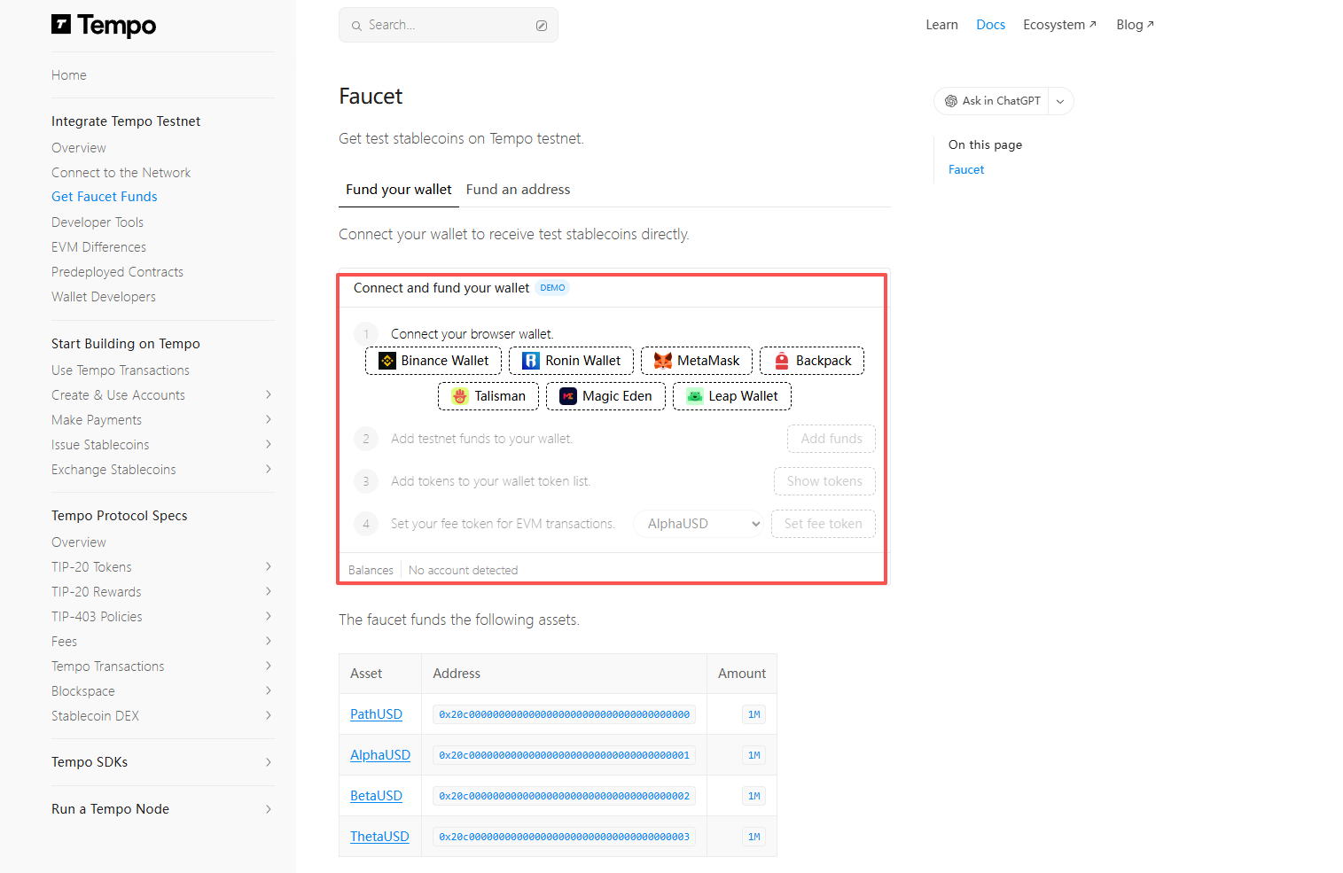 STEP 1. 进入官方文档(链接:https://docs.tempo.xyz/quickstart/faucet),点击连接 Web3 钱包后将 Tempo 测试网添加到钱包网络中。