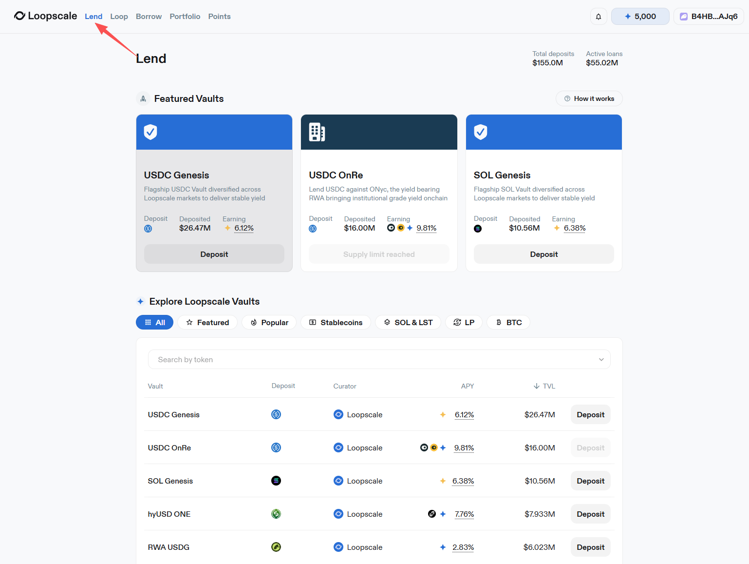 STEP 1. 进入官网(链接:https://app.loopscale.com/lend),点击“Points”,连接支持 Solana 生态的钱包,完成两个社交任务获得 5000 积分。