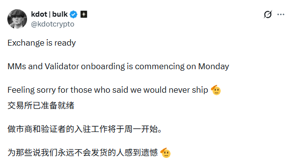 BULK 为 Solana 生态 Perp DEX 项目,平台将撮合引擎嵌入验证节点,当用户发一个订单,不需要走 Solana 普通的“交易队列”,而是直接进入验证者节点内置的 Bulk-Tile 模块,撮合可以在 20 ms 内完成匹配,并在 40 ms 内确认完成。