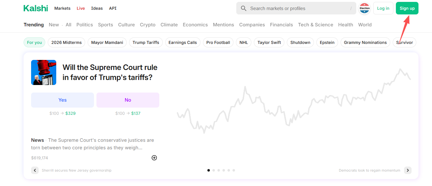 进入官网(https://kalshi.com/),点击“Sign Up”通过谷歌邮箱进行账号注册,并且需要通过 KYC 认证。