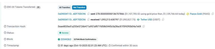 另一笔交易中,用户用价值约 110.7 万美元的 PAXG(按当时金价)换得 109.3 万 USDT,滑点约为 1.3%。虽然滑点没有前者那么极端,但在传统市场的价格冲击通常以个位数基点计量时,这样的滑点水平依然高得难以接受。