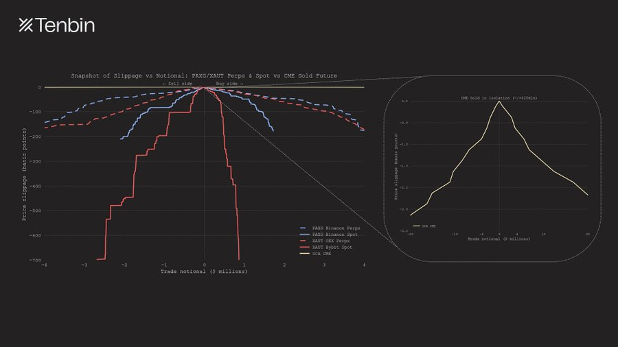 以代币化黄金为例,下图对比了主要中心化交易所与传统黄金市场在不同交易规模下的预期滑点,差异一目了然。