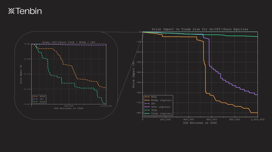 TSLAx 与 NVDAx 是目前市值排名靠前的代币化股票。在 Jupiter 上,一笔 100 万美元规模的 TSLAx 交易,滑点约为 5%;而 NVDAx 的滑点则高达 80%,几乎失去可交易性。相比之下,在传统市场中,同等规模的特斯拉或英伟达股票交易,其价格冲击仅为 18 个基点与 14 个基点(这还未计入暗池等场外流动性)。