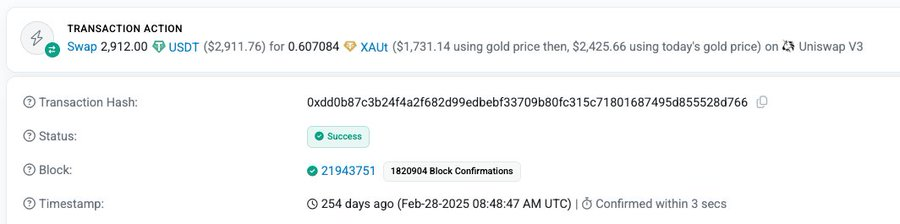 例如,2025 年 2 月的一笔 XAUT 交易中,用户花费了 2,912 USDT,却只买到了按当时真实金价计算约 1,731 美元价值的 XAUT,等于为这笔交易支付了高达 68% 的溢价。