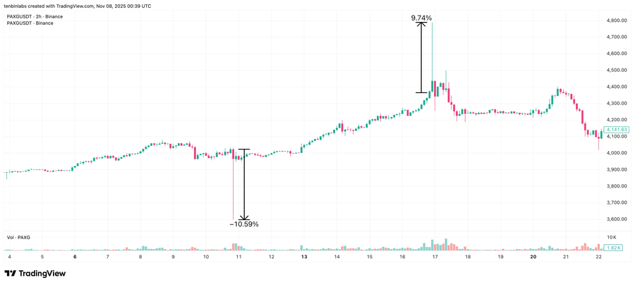 2025 年 10 月中旬,PAXG 在 Binance 现货市场一周内经历了两次明显“异常“的事件。10 月 10 日,价格下跌 10.6%;10 月 16 日,价格飙升 9.7%。两次波动均快速回归原位,几乎可以确定并非基本面变化所致,而是订单簿脆弱性的直接体现。