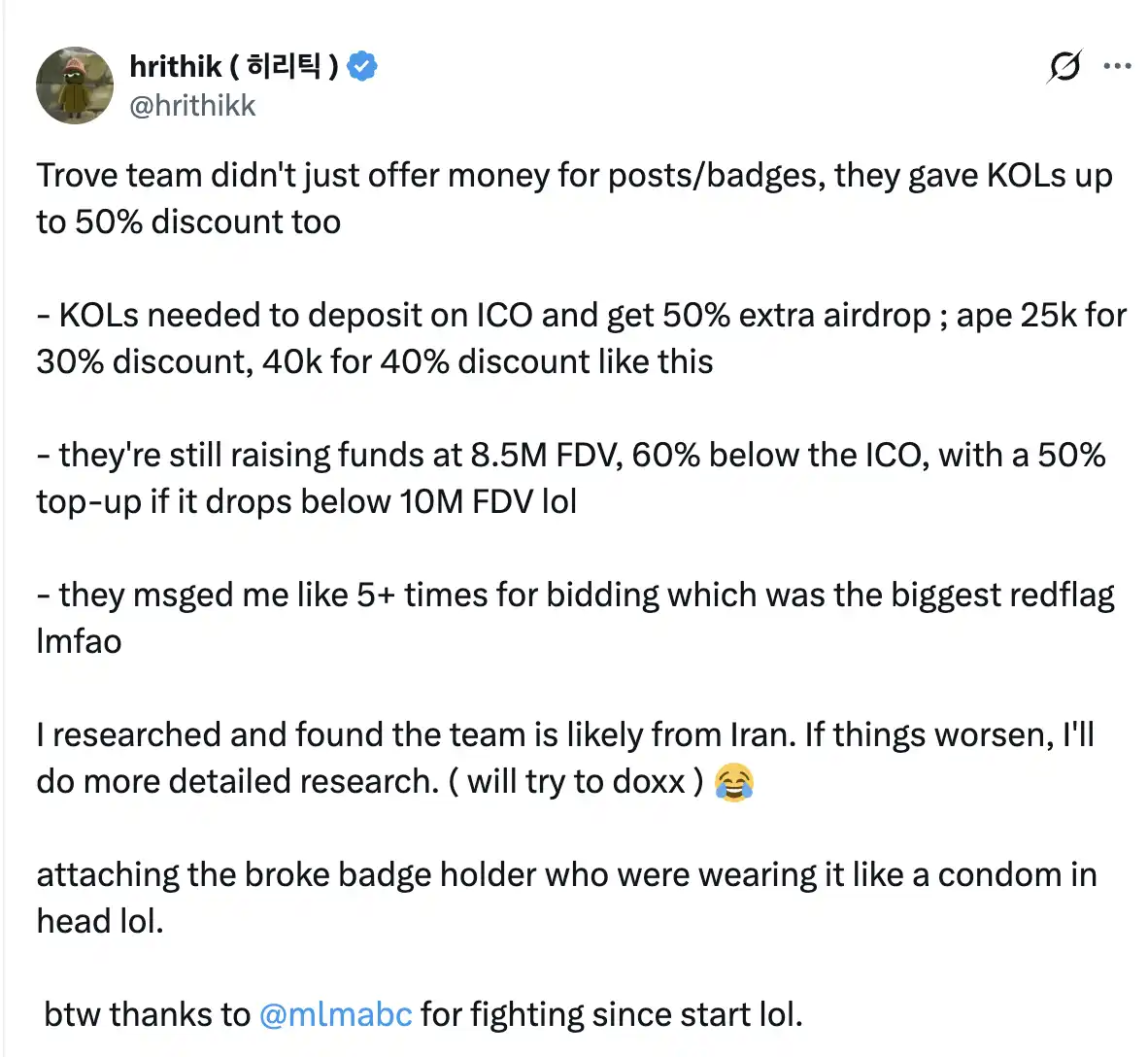 KOL @hrithikk 表示,Trove 团队不仅给 KOL 提供了丰厚的营销费用,还私下提供了低至 850 万美元估值的 ICO 额度,折扣高达 60%,并附带巨额空投奖励。目前 Trove 仍在在以低价出售份额,并超过 5 次向他询问是否能够投资 Trove。