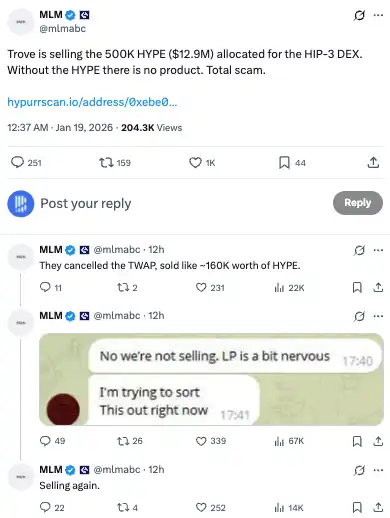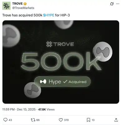 12 月中旬,Trove 宣布斥资超 2000 万美元收购了 50 万枚 HYPE 代币,以满足 HIP-3 的集成要求。紧接着测试网积分计划开启,平台交易量在两周内突破 100 万美元,一切都在向着预期的方向发展。直到...