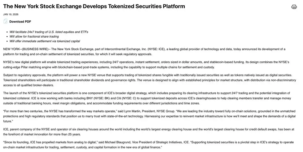 3. NYSE 母公司 ICE 同时正与 BNY Mellon、花旗等银行业巨头合作,探索代币化存款与清算基础设施,以支持跨时区、全天候的资金与保证金管理。