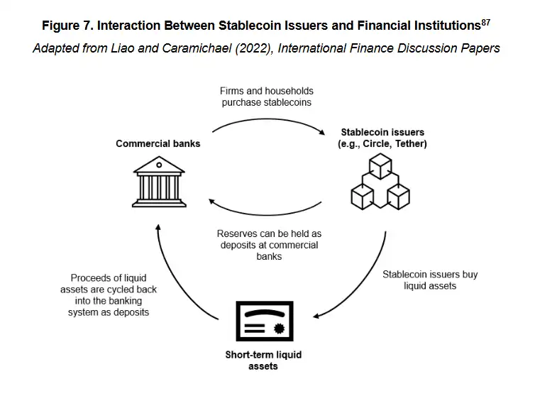 但稍微对稳定币运行逻辑有一定了解的话,都能看出这一表述存在着很大的迷惑性与误导性。因为当 1 美元流入 USDC 等稳定币系统时,这 1 美元并不会凭空消失,而是会被至于 Circle 等稳定币发行方的储备财库中,最终再次以现金存款或其他短期流动资产(如国债)的形式回流至银行系统。