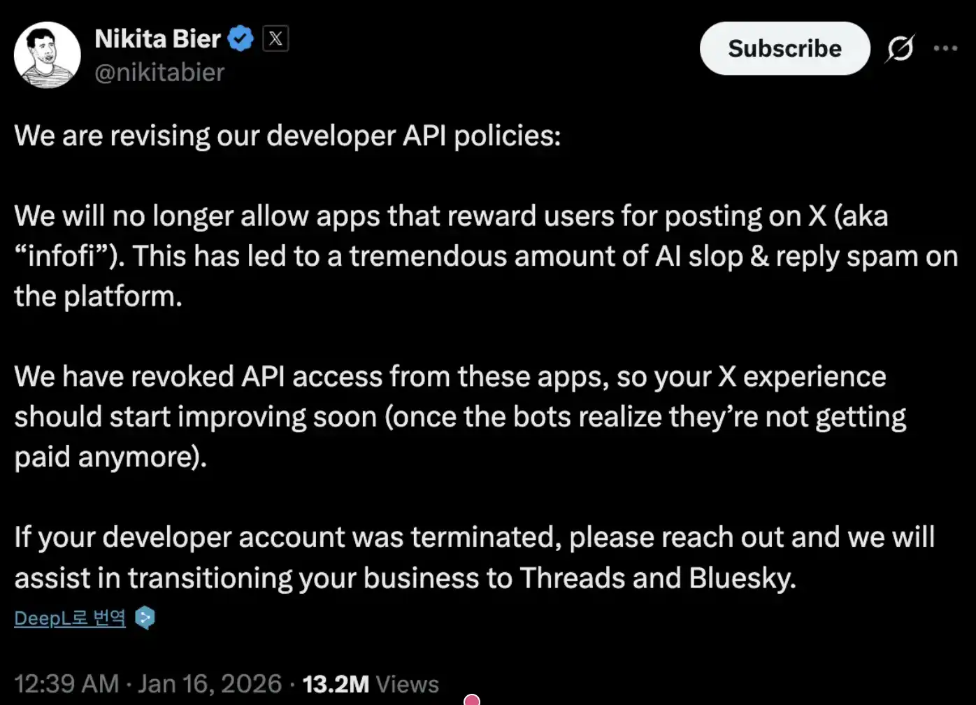 1 月 15 日,X 的产品负责人 Nikita Bier 发布了一条简短动态,明确表示:平台将不再允许那些「以奖励换取发帖」的应用继续运行。对 InfoFi 项目而言,这几乎等同于宣判终局。